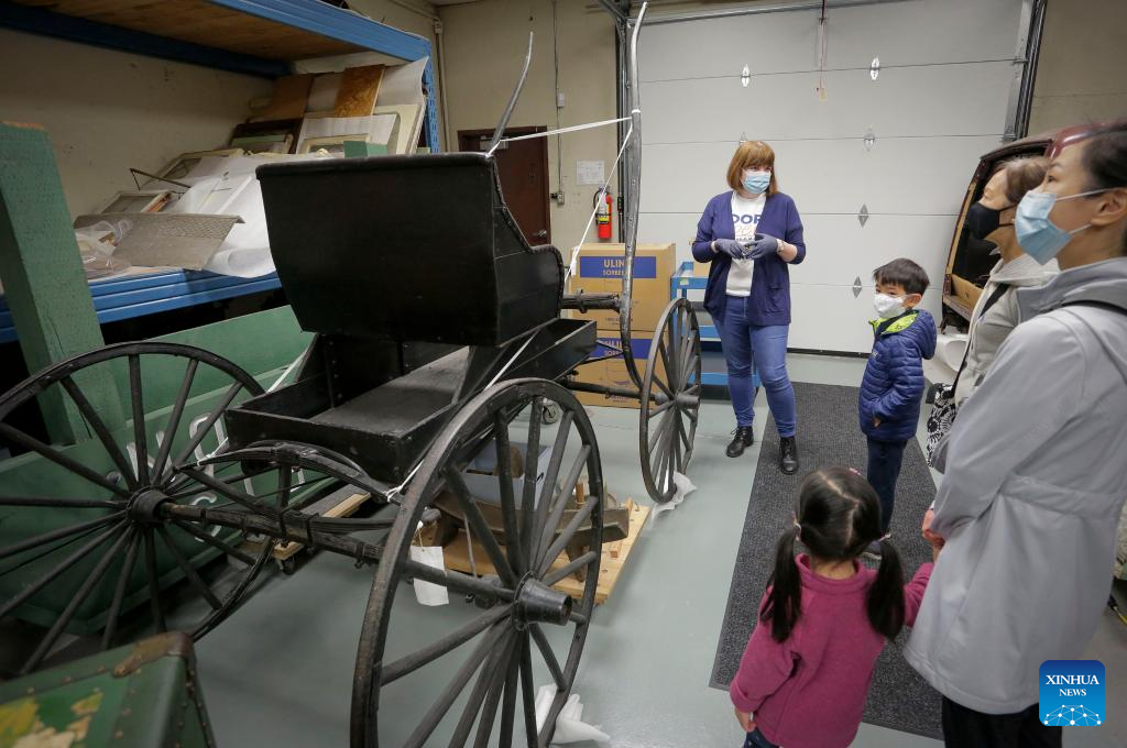 People look at a carriage made in 1900s at Richmond Museum's artifact storage warehouse during the Doors Open Richmond event in Richmond, British Columbia, Canada, on June 4, 2022. Richmond Museum's artifact storage warehouse, a place where the city stores historical artifact collections, offered the public an opportunity to have a behind-the-scene tour during the Doors Open Richmond event. (Photo by Liang Sen/Xinhua)