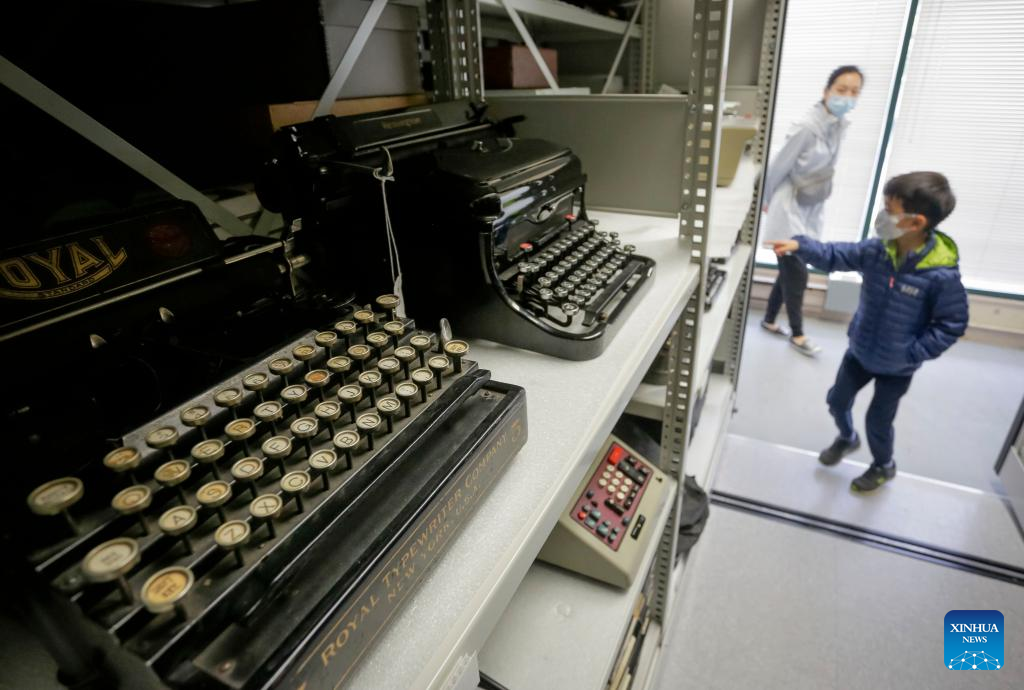 Typewriters are displayed at Richmond Museum's artifact storage warehouse during the Doors Open Richmond event in Richmond, British Columbia, Canada, on June 4, 2022. Richmond Museum's artifact storage warehouse, a place where the city stores historical artifact collections, offered the public an opportunity to have a behind-the-scene tour during the Doors Open Richmond event. (Photo by Liang Sen/Xinhua)