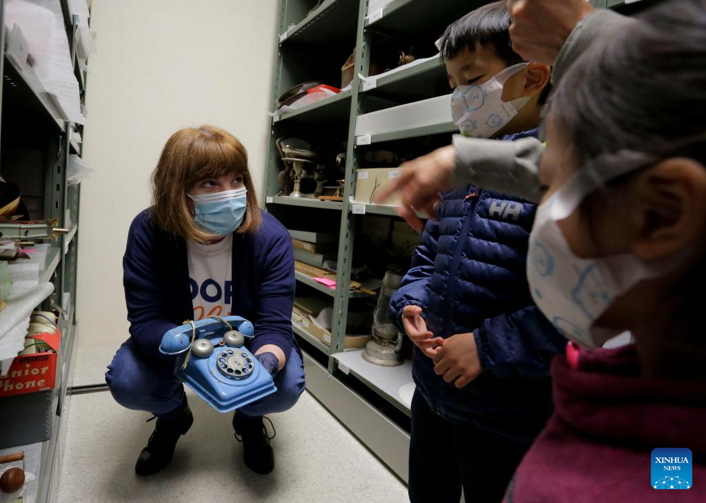 A staff member shows a metal toy telephone made in 1950s at Richmond Museum's artifact storage warehouse during the Doors Open Richmond event in Richmond, British Columbia, Canada, on June 4, 2022. Richmond Museum's artifact storage warehouse, a place where the city stores historical artifact collections, offered the public an opportunity to have a behind-the-scene tour during the Doors Open Richmond event. (Photo by Liang Sen/Xinhua)