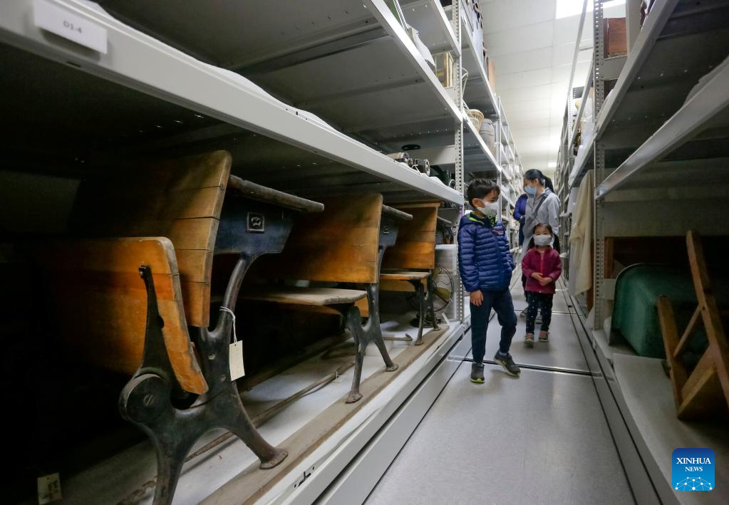 People visit Richmond Museum's artifact storage warehouse during the Doors Open Richmond event in Richmond, British Columbia, Canada, on June 4, 2022. Richmond Museum's artifact storage warehouse, a place where the city stores historical artifact collections, offered the public an opportunity to have a behind-the-scene tour during the Doors Open Richmond event. (Photo by Liang Sen/Xinhua)