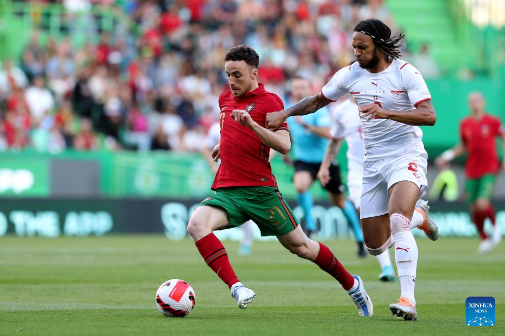 Portugal's Diogo Jota (L) vies with Switzerland's Kevin Mbabu during their UEFA Nations League football match in Lisbon, Portugal, on June 5, 2022. (Photo by Pedro Fiuza/Xinhua)