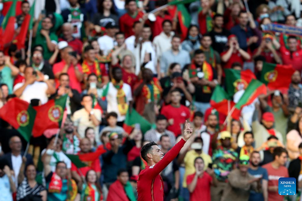 Portugal's Cristiano Ronaldo celebrates after scoring during the UEFA Nations League football match between Portugal and Switzerland in Lisbon, Portugal, on June 5, 2022. (Photo by Pedro Fiuza/Xinhua)