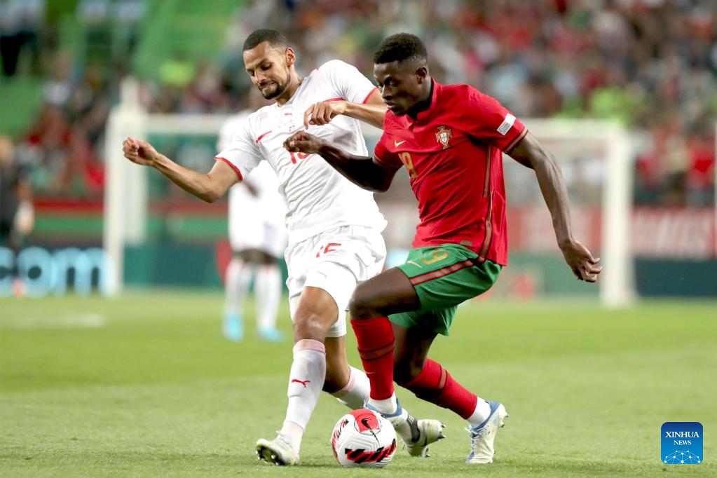 Portugal's Nuno Mendes (R) vies with Switzerland's Djibril Sowof during their UEFA Nations League football match in Lisbon, Portugal, on June 5, 2022. (Photo by Pedro Fiuza/Xinhua)