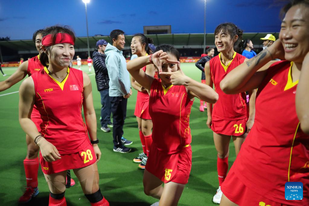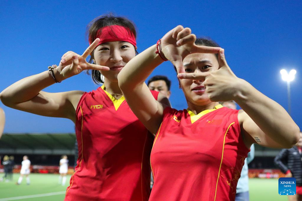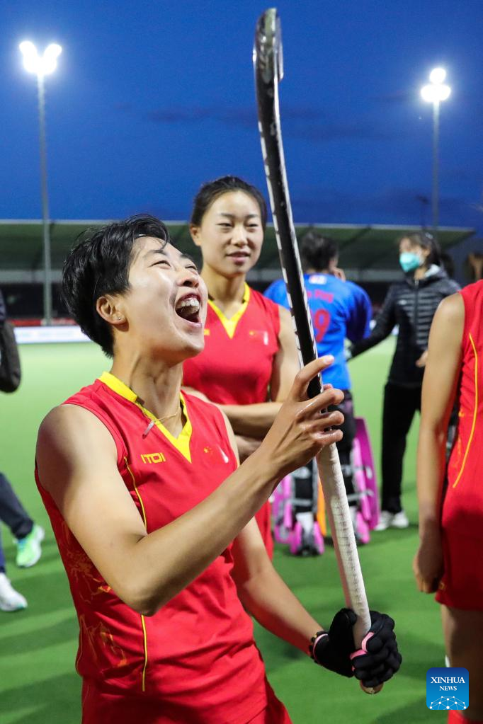 Zhang Xiaoxue (front) of China celebrates after the FIH Hockey Pro League match between Belgium and China in Antwerp, Belgium, June 8, 2022. After 1-1 tie in the regular time, Chinese women's hockey team defeated Belgian women's hockey team by 2-0 in the shootout. (Xinhua/Zheng Huansong)