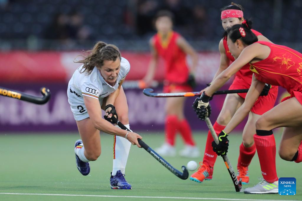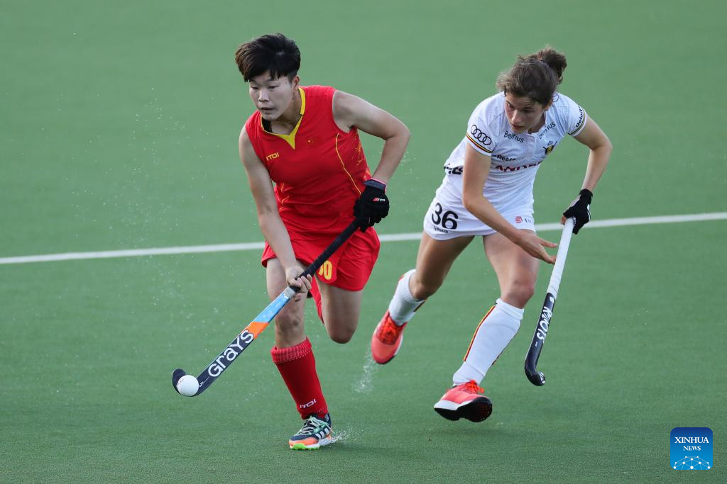 Zhang Xindan (L) of China vies with Helene Brasseur of Belgium during the FIH Hockey Pro League match between Belgium and China in Antwerp, Belgium, June 8, 2022. After 1-1 tie in the regular time, Chinese women's hockey team defeated Belgian women's hockey team by 2-0 in the shootout. (Xinhua/Zheng Huansong)