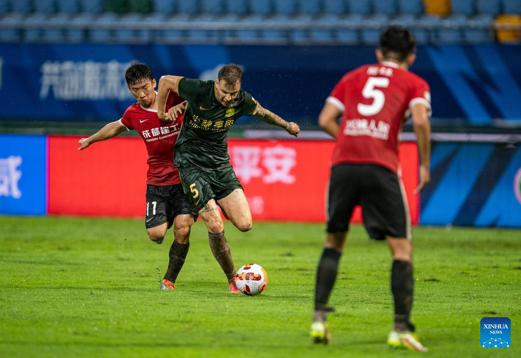 Felipe de Sousa Silva (C) of Chengdu Rongcheng competes during a 2022 season Chinese Football Association Super League (CSL) match between Beijing Guoan and Chengdu Rongcheng in Meizhou, south China's Guangdong Province, June 8, 2022. (Xinhua/Sun Fei)