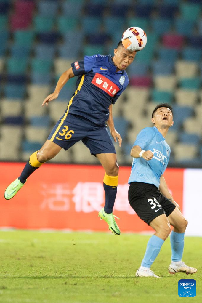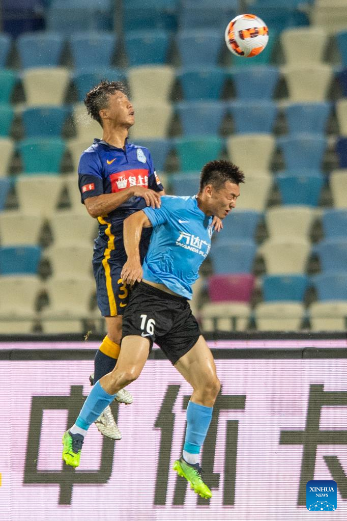 Tong Lei (R) of Dalian Pro vies with Jin Bo of Guangzhou City to head the ball during a 2022 season Chinese Football Association Super League (CSL) match between Dalian Pro and Guangzhou City in Haikou, south China's Hainan Province, June 8, 2022. (Xinhua/Hu Zhixuan)
