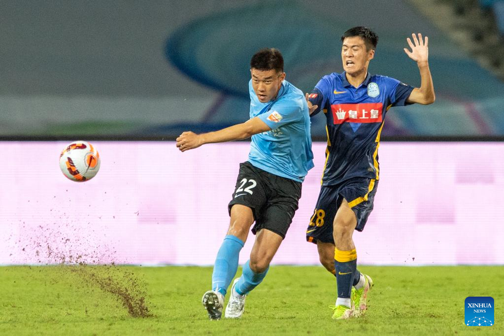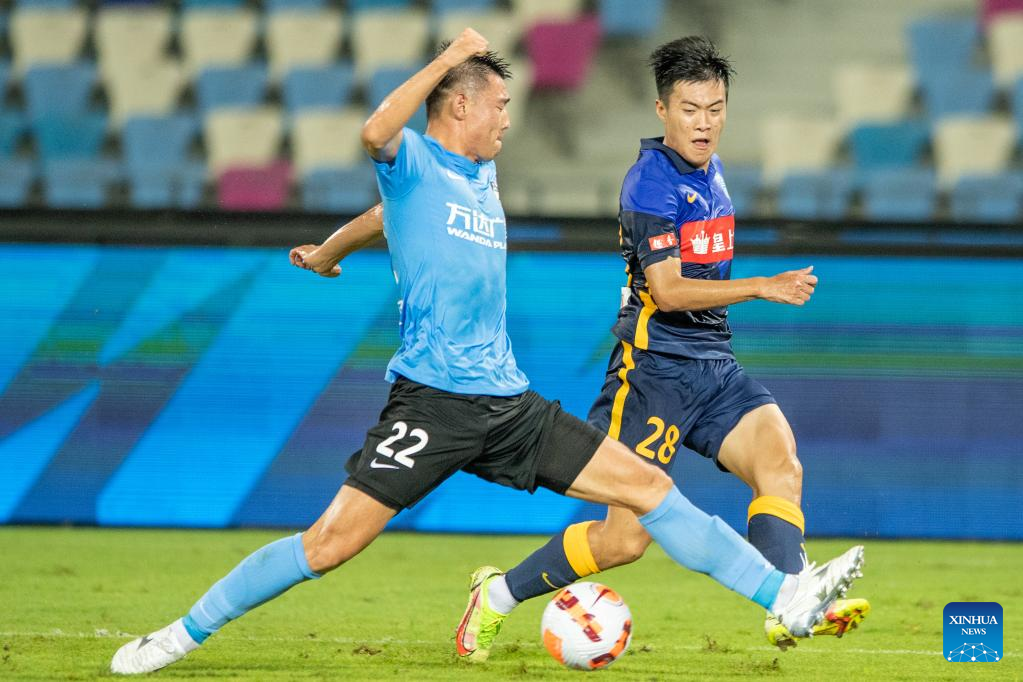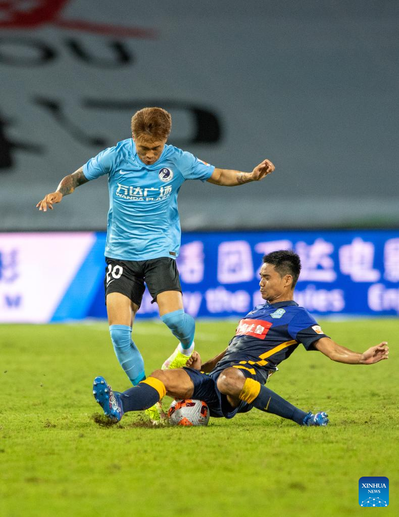Dong Yanfeng (L) of Dalian Pro vies with Wu Chengru of Guangzhou City during a 2022 season Chinese Football Association Super League (CSL) match between Dalian Pro and Guangzhou City in Haikou, south China's Hainan Province, June 8, 2022. (Xinhua/Hu Zhixuan)