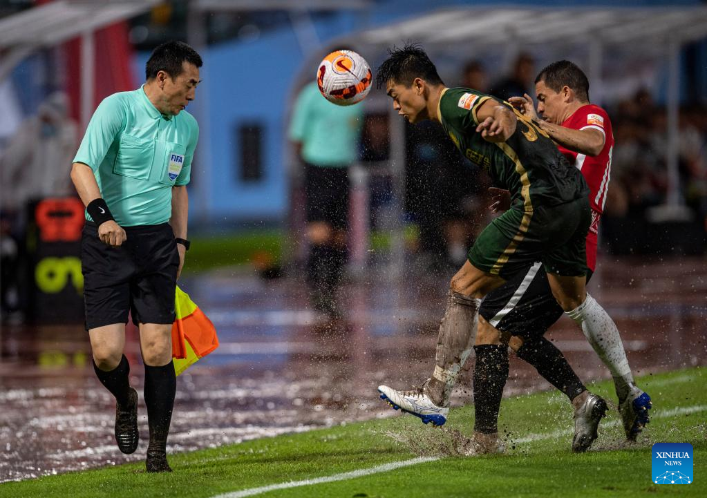 Referee communicates with players of both sides during a 2022 season Chinese Football Association Super League (CSL) match between Beijing Guoan and Chengdu Rongcheng in Meizhou, south China's Guangdong Province, June 8, 2022. (Xinhua/Sun Fei)