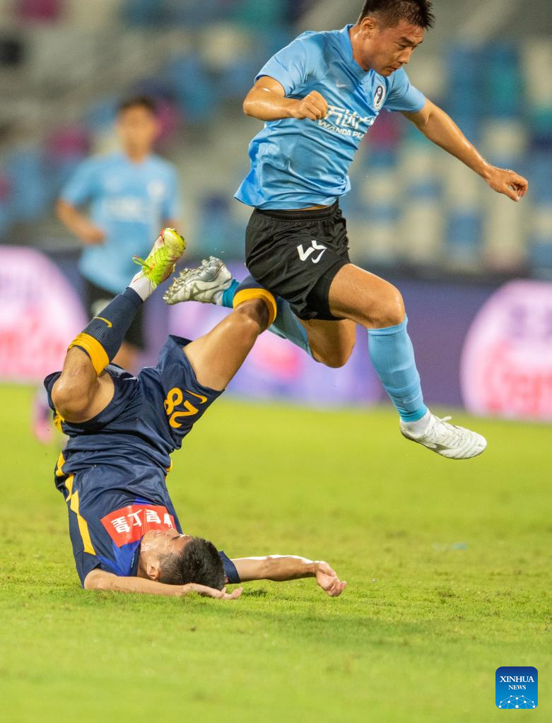 Wu Chengru (Bottom) of Guangzhou City falls down during a 2022 season Chinese Football Association Super League (CSL) match between Dalian Pro and Guangzhou City in Haikou, south China's Hainan Province, June 8, 2022. (Xinhua/Hu Zhixuan)
