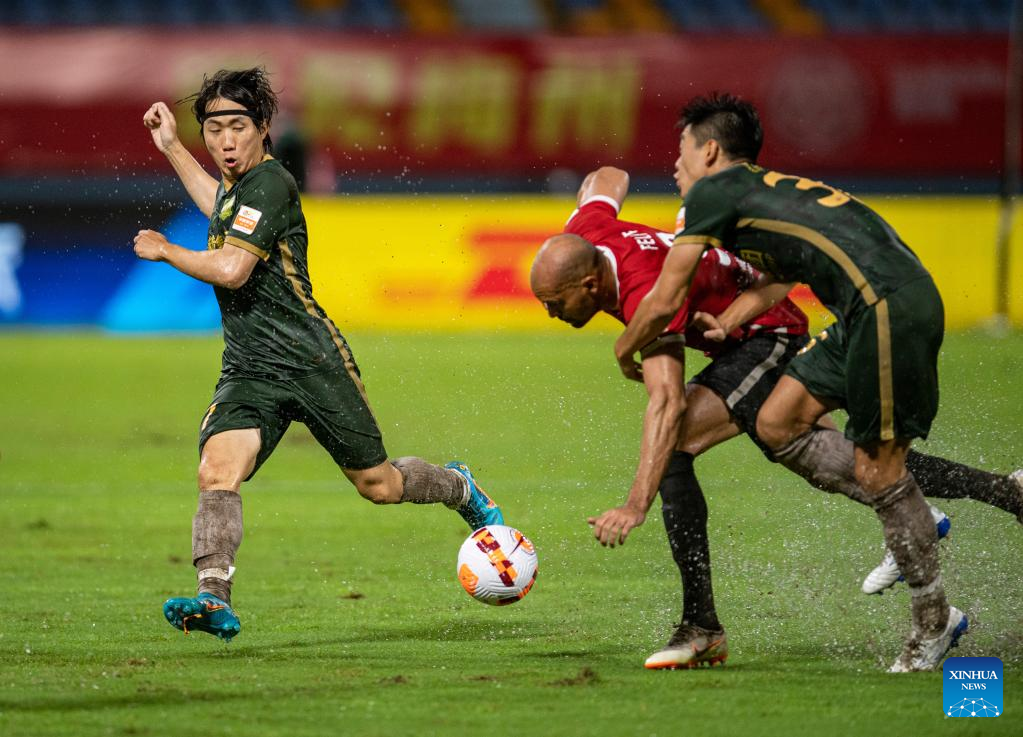 Dong Yanfeng (L) of Dalian Pro passes the ball during a 2022 season Chinese Football Association Super League (CSL) match between Dalian Pro and Guangzhou City in Haikou, south China's Hainan Province, June 8, 2022. (Xinhua/Hu Zhixuan)