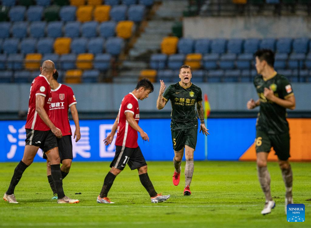Samir Memisevic (2nd R) of Beijing Guoan celebrates during a 2022 season Chinese Football Association Super League (CSL) match between Beijing Guoan and Chengdu Rongcheng in Meizhou, south China's Guangdong Province, June 8, 2022. (Xinhua/Sun Fei)