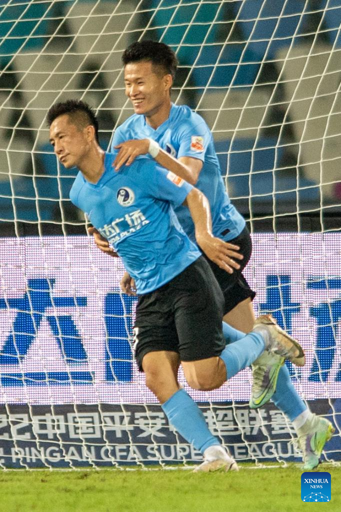 Yan Xiangchuang (L) of Dalian Pro celebrates scoring with his teammate during a 2022 season Chinese Football Association Super League (CSL) match between Dalian Pro and Guangzhou City in Haikou, south China's Hainan Province, June 8, 2022. (Xinhua/Hu Zhixuan)