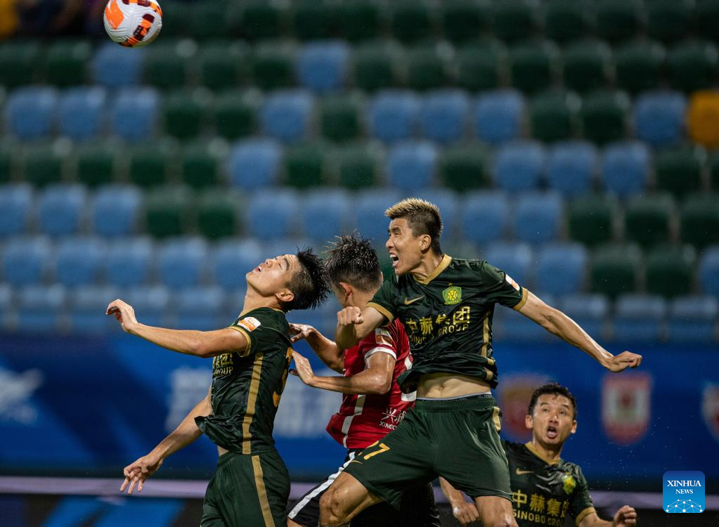 Wang Gang (Top R) of Beijing Guoan tries to head the ball during a 2022 season Chinese Football Association Super League (CSL) match between Beijing Guoan and Chengdu Rongcheng in Meizhou, south China's Guangdong Province, June 8, 2022. (Xinhua/Sun Fei)