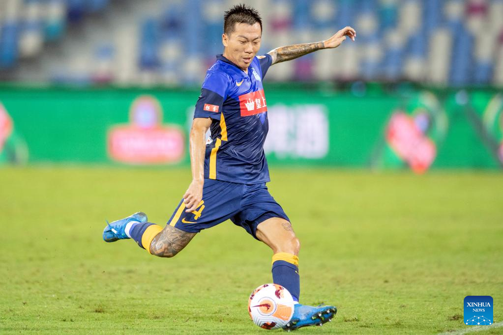 Zhang Gong of Guangzhou City shoots during a 2022 season Chinese Football Association Super League (CSL) match between Dalian Pro and Guangzhou City in Haikou, south China's Hainan Province, June 8, 2022. (Xinhua/Hu Zhixuan)