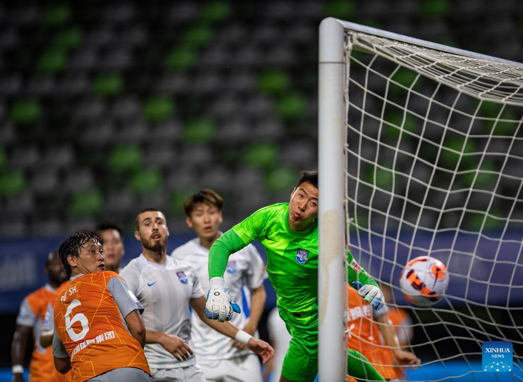 Fang Jingqi (1st R) of Tianjin Jinmen Tiger fails to catch the ball during a 2022 season Chinese Football Association Super League (CSL) match between Tianjin Jinmen Tiger and Shenzhen FC in Meizhou, south China's Guangdong Province, June 9, 2022. (Xinhua/Sun Fei)
