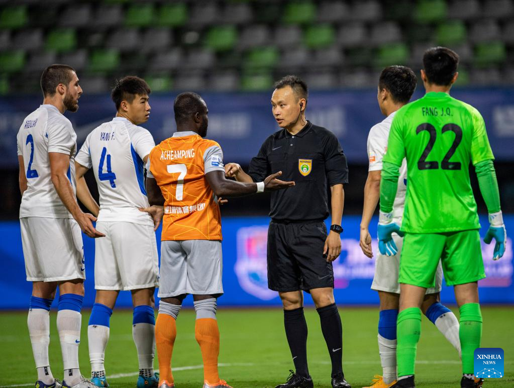 Referee Wang Jing (3rd R) communicates with players during a 2022 season Chinese Football Association Super League (CSL) match between Tianjin Jinmen Tiger and Shenzhen FC in Meizhou, south China's Guangdong Province, June 9, 2022. (Xinhua/Sun Fei)