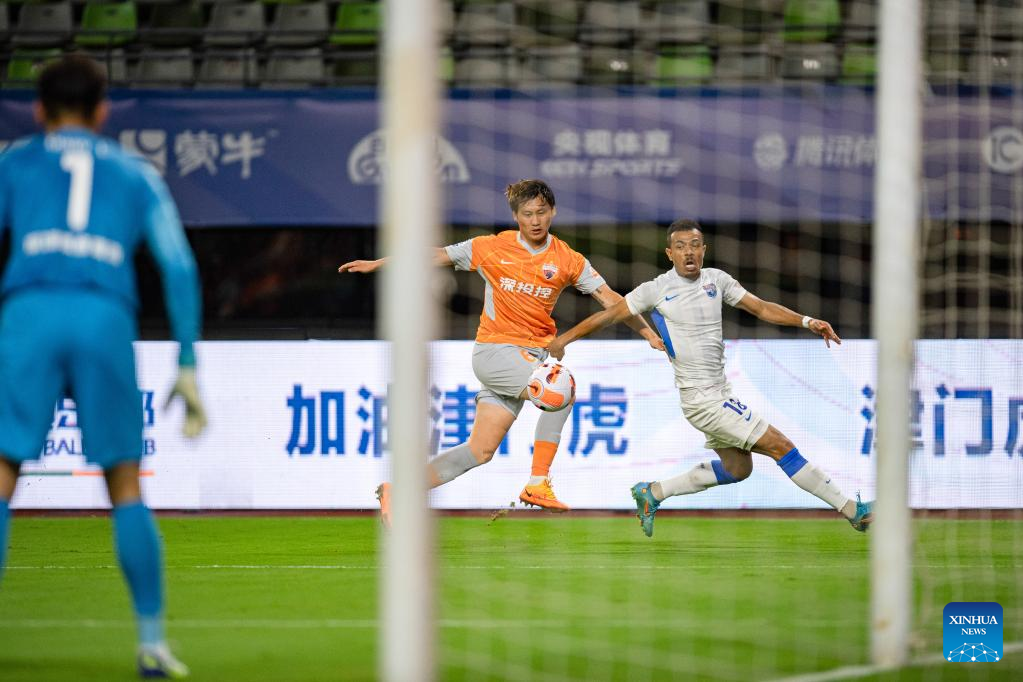 Su Yuanjie (L) of Tianjin Jinmen Tiger competes during a 2022 season Chinese Football Association Super League (CSL) match between Tianjin Jinmen Tiger and Shenzhen FC in Meizhou, south China's Guangdong Province, June 9, 2022. (Xinhua/Sun Fei)
