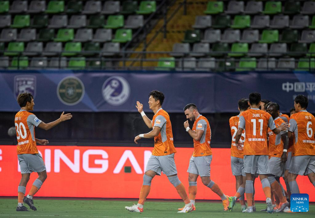 Players of Shenzhen celebrate scoring during a 2022 season Chinese Football Association Super League (CSL) match between Tianjin Jinmen Tiger and Shenzhen FC in Meizhou, south China's Guangdong Province, June 9, 2022. (Xinhua/Sun Fei)