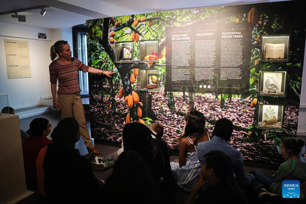 A staff member explains the cultivation of cocoa tress to visitors in the Belgian Chocolate Village in Brussels, Belgium, June 9, 2022. The Belgian Chocolate Village is a museum to showcase the knowledge, history and culture related to chocolate. (Xinhua/Zheng Huansong)