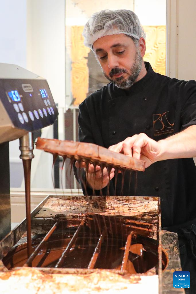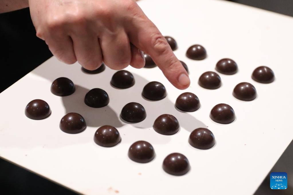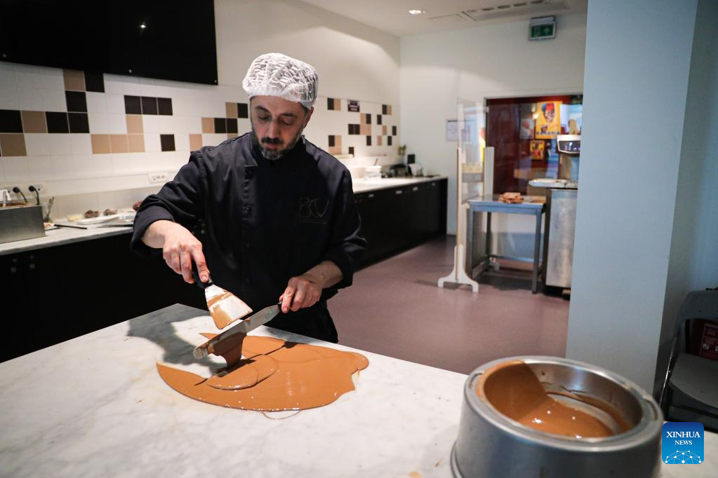 A staff member shows the fresh-made chocolate in the Belgian Chocolate Village in Brussels, Belgium, June 9, 2022. The Belgian Chocolate Village is a museum to showcase the knowledge, history and culture related to chocolate. (Xinhua/Zheng Huansong)