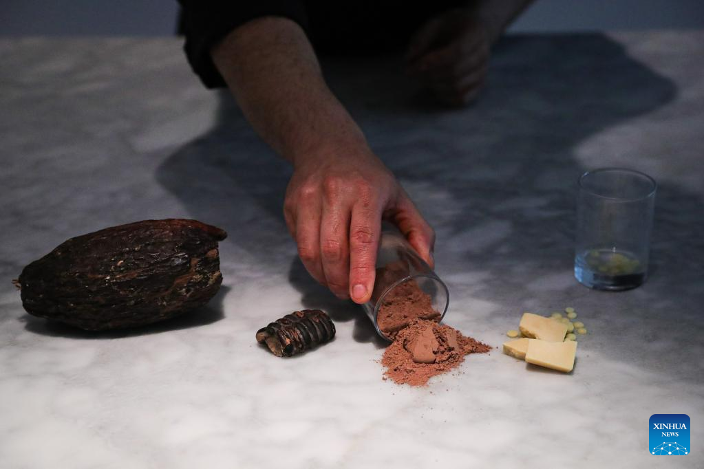A staff member shows the making of chocolate in the Belgian Chocolate Village in Brussels, Belgium, June 9, 2022. The Belgian Chocolate Village is a museum to showcase the knowledge, history and culture related to chocolate. (Xinhua/Zheng Huansong)