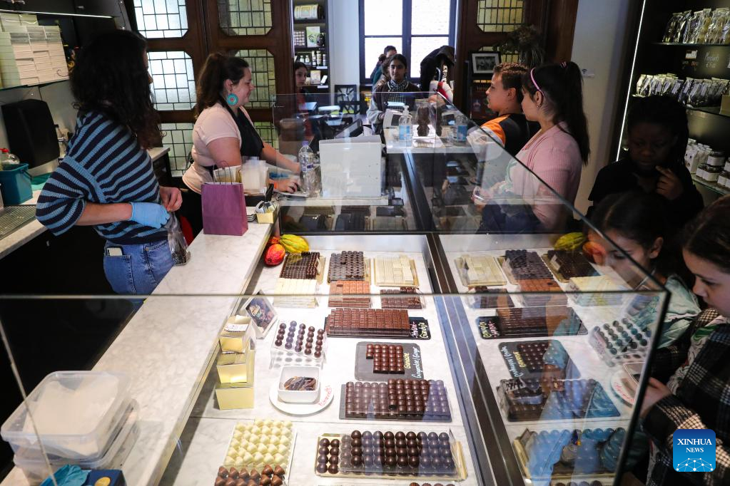 Visitors buy chocolate products in the Belgian Chocolate Village in Brussels, Belgium, June 9, 2022. The Belgian Chocolate Village is a museum to showcase the knowledge, history and culture related to chocolate. (Xinhua/Zheng Huansong)