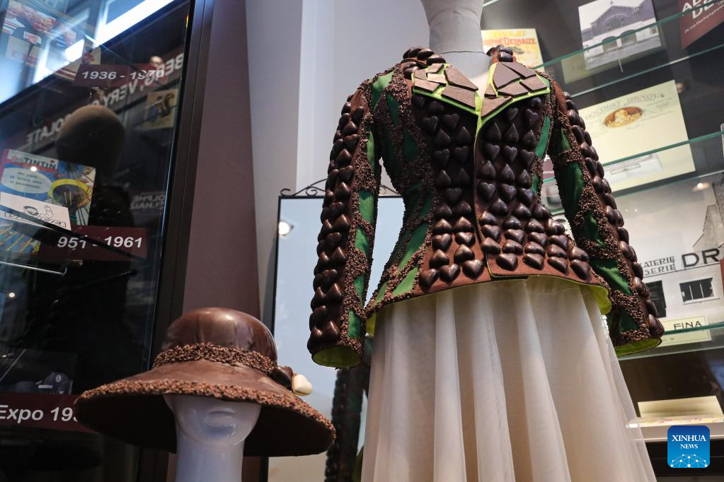 A hat and a jacket made from chocolate are displayed in the Belgian Chocolate Village in Brussels, Belgium, June 9, 2022. The Belgian Chocolate Village is a museum to showcase the knowledge, history and culture related to chocolate. (Xinhua/Zheng Huansong)