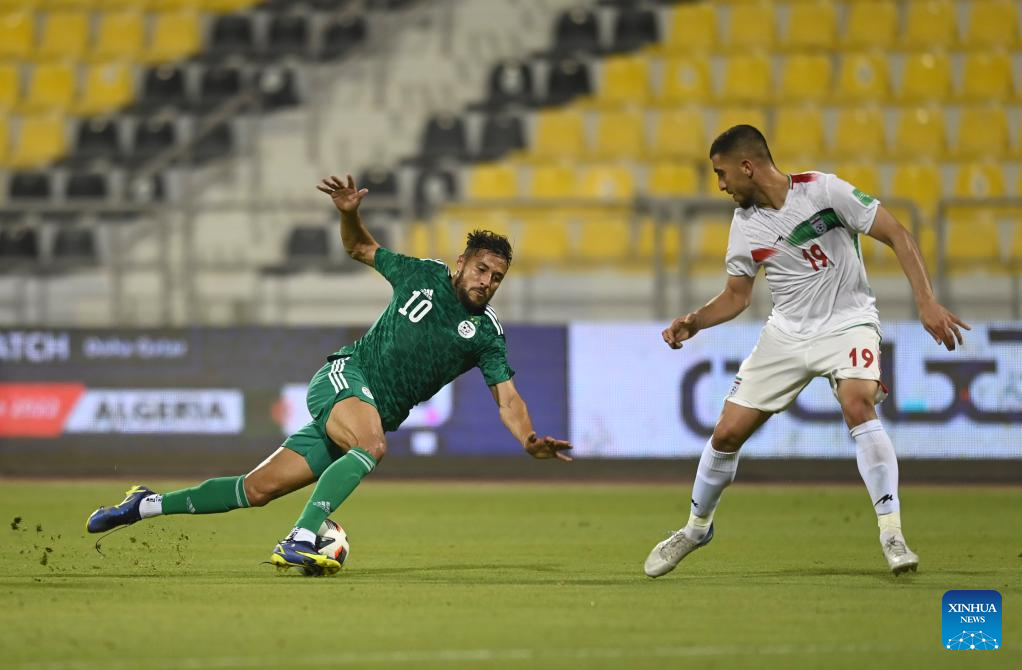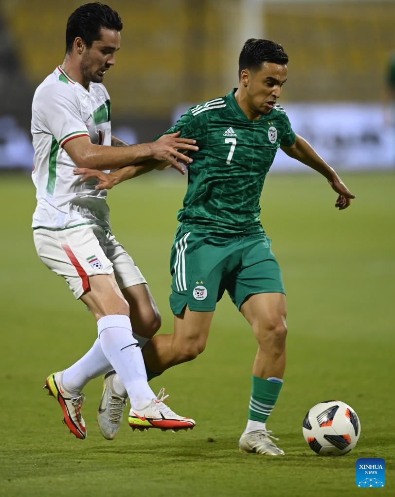 Algeria's player Akim Zedadka (R) vies with Iran's player Mehdi Taremi during an international friendly football match between Iran and Algeria at Qatar Sports Club in Doha, capital of Qatar, June 12, 2022. (Photo by Niklku/Xinhua)
