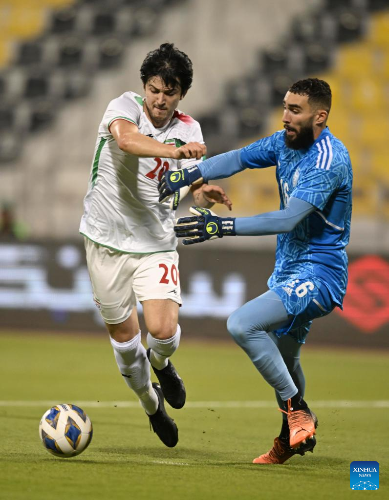 Algeria's player Mohamed Amine Tougai (L) vies with Iran's player Mehdi Taremi during an international friendly football match between Iran and Algeria at Qatar Sports Club in Doha, capital of Qatar, June 12, 2022. (Photo by Niklku/Xinhua)
