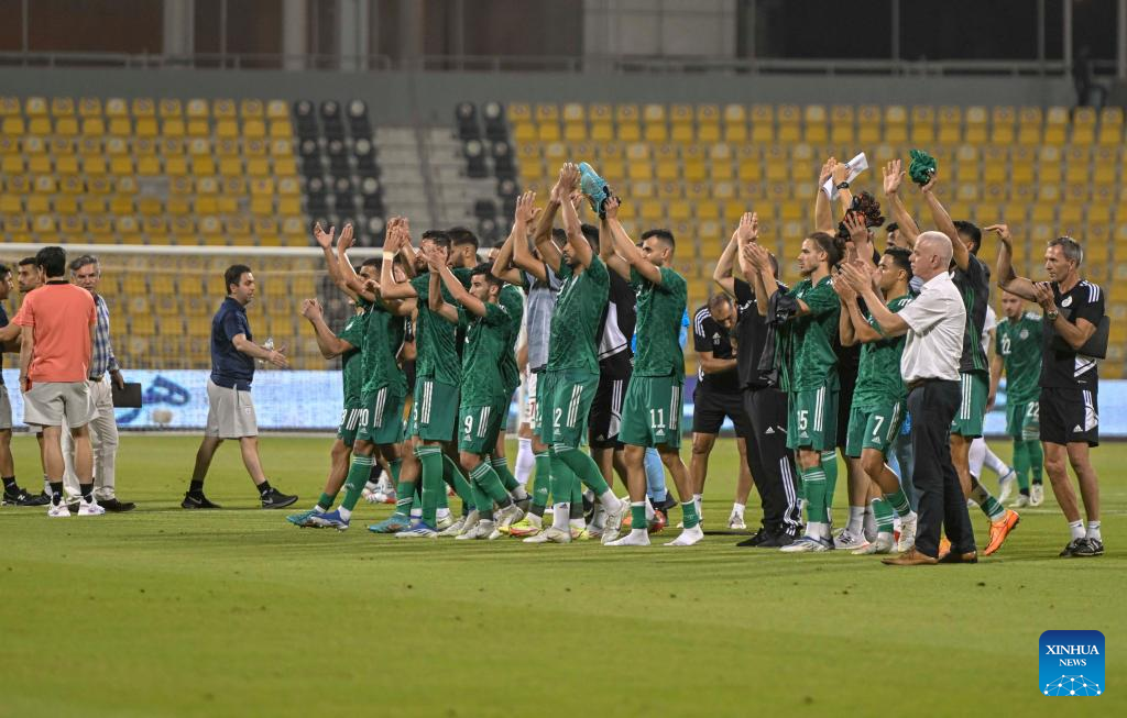 Algeria's players celebrate after winning an international friendly football match between Iran and Algeria at Qatar Sports Club in Doha, capital of Qatar, June 12, 2022. (Photo by Niklku/Xinhua)