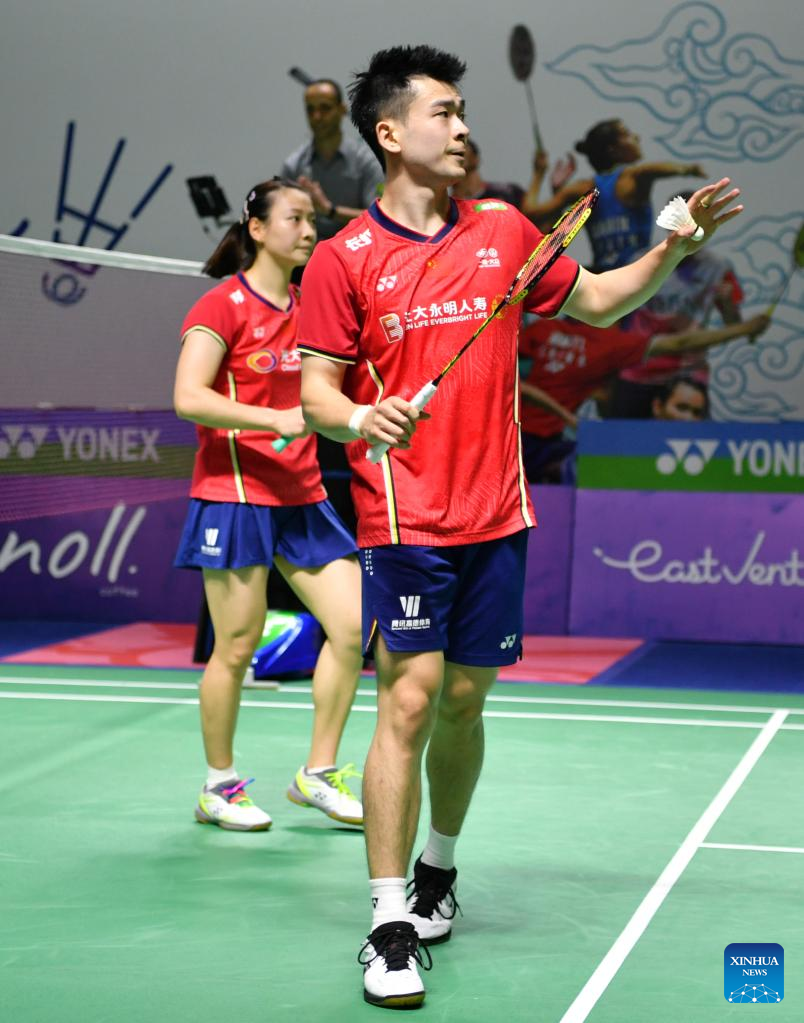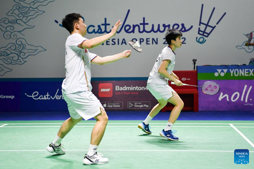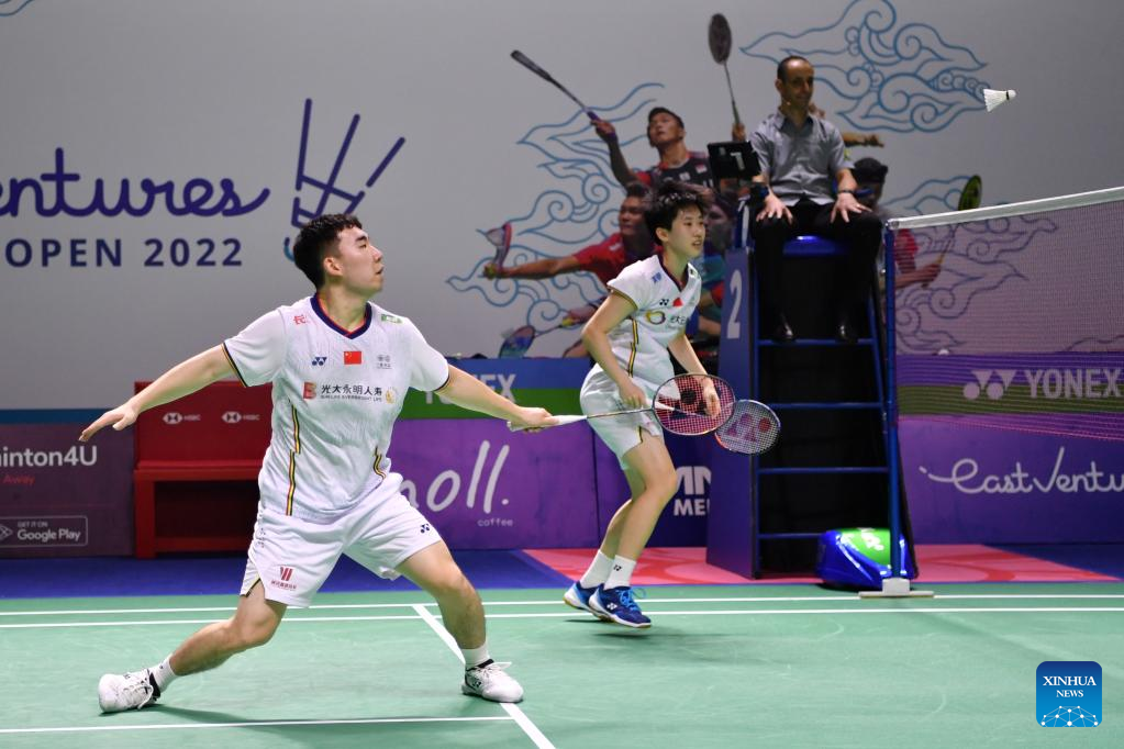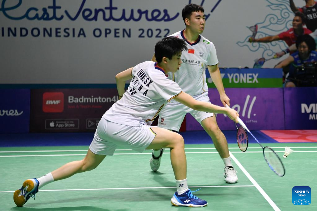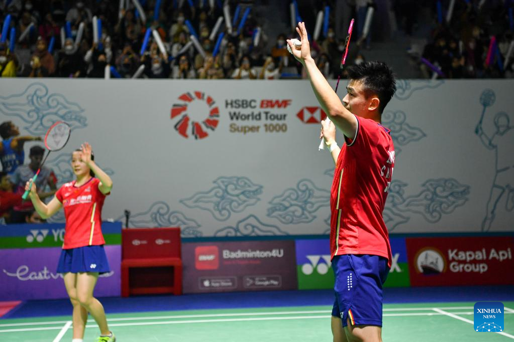 Guo Xinwa (R)/Zhang Shuxian compete during the mixed doubles round of 32 match between Zheng Siwei/Huang Yaqiong of China and Guo Xinwa/Zhang Shuxian of China at Indonesia Open 2022 in Jakarta, Indonesia, on June 15, 2022. (Xinhua/Xu Qin)