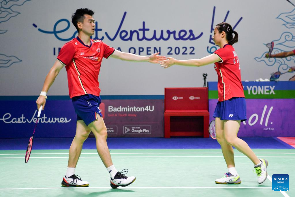 Zheng Siwei (R)/Huang Yaqiong acknowledge the spectators after the mixed doubles round of 32 match between Zheng Siwei/Huang Yaqiong of China and Guo Xinwa/Zhang Shuxian of China at Indonesia Open 2022 in Jakarta, Indonesia, on June 15, 2022. (Xinhua/Xu Qin)
