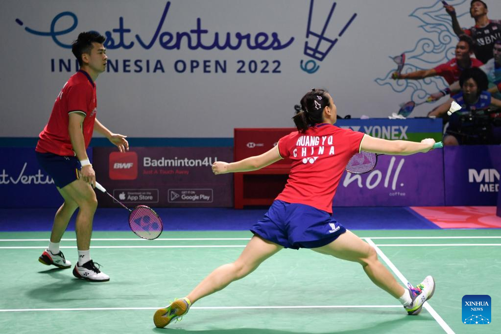 Zheng Siwei (L)/Huang Yaqiong compete during the mixed doubles round of 32 match between Zheng Siwei/Huang Yaqiong of China and Guo Xinwa/Zhang Shuxian of China at Indonesia Open 2022 in Jakarta, Indonesia, on June 15, 2022. (Xinhua/Xu Qin)