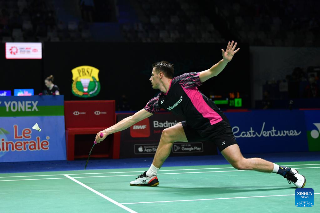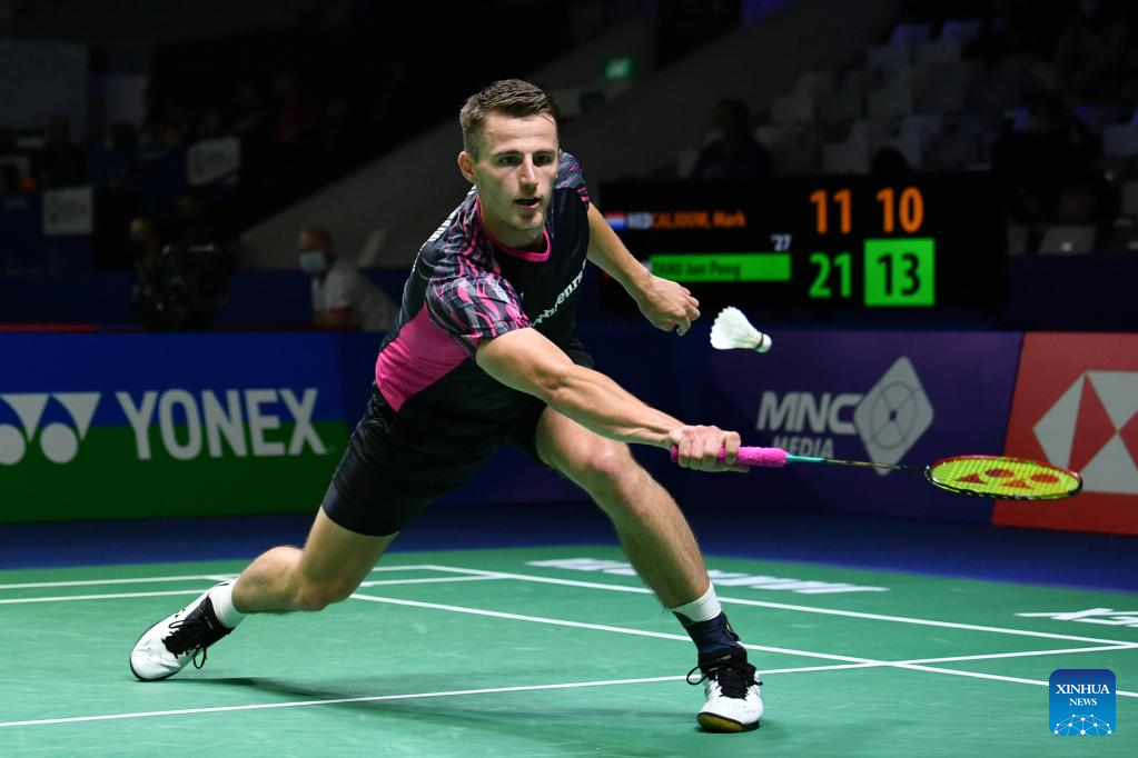Netherlands' Mark Caljouw hits a return during the men's singles round of 32 match against China's Zhao Junpeng at Indonesia Open 2022 in Jakarta, Indonesia, June 15, 2022. (Xinhua/Xu Qin)