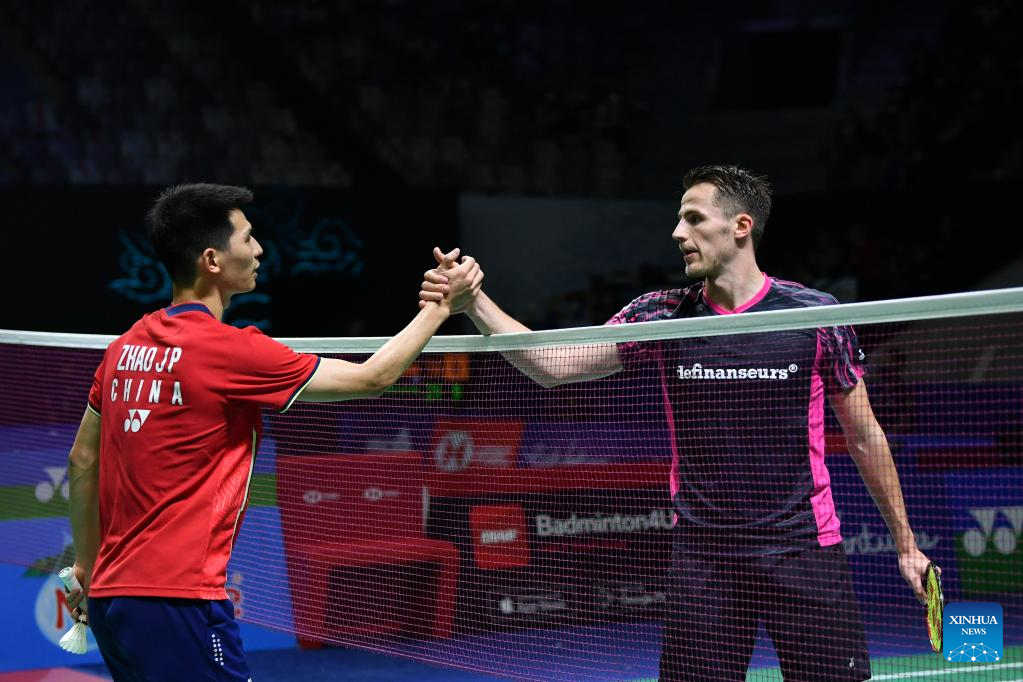 China's Zhao Junpeng (L) shakes hands with Netherlands' Mark Caljouw after their men's singles round of 32 match at Indonesia Open 2022 in Jakarta, Indonesia, June 15, 2022. (Xinhua/Xu Qin)