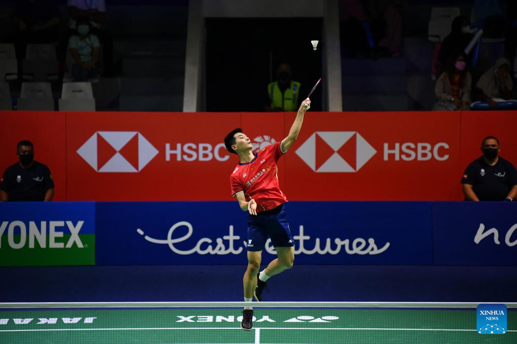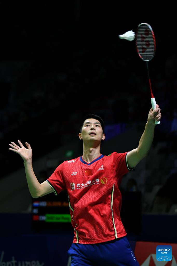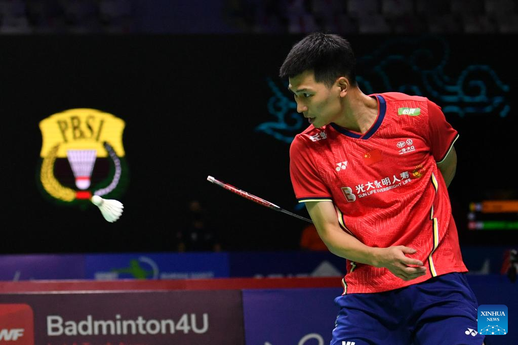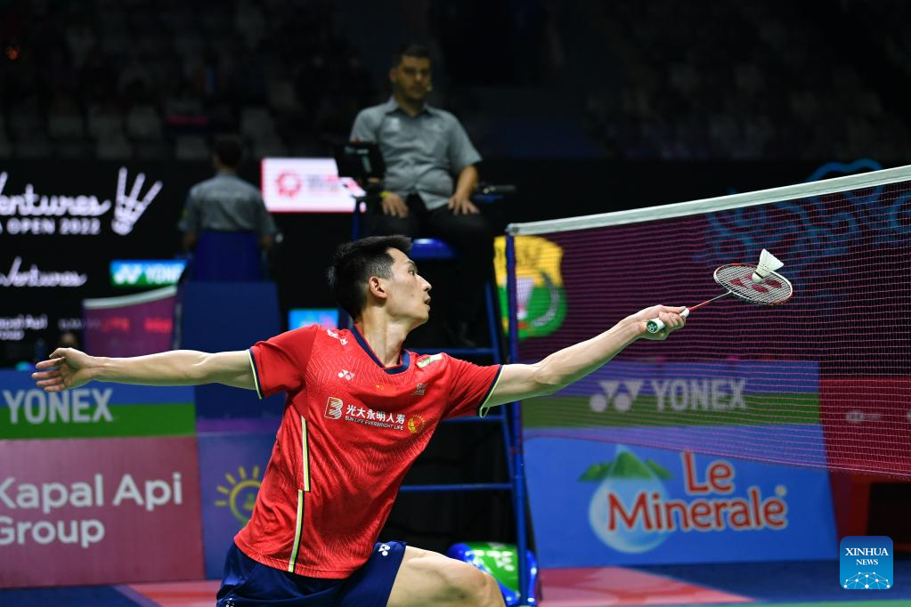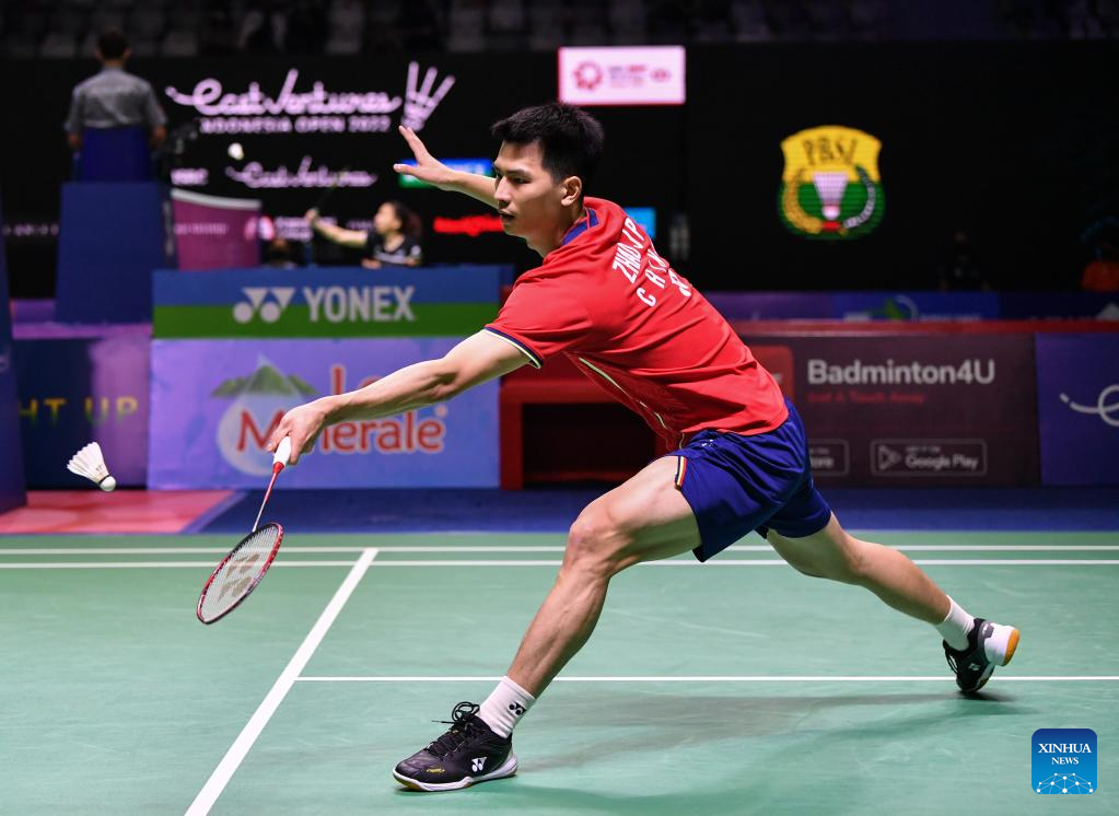 China's Zhao Junpeng hits a return during the men's singles round of 32 match against Netherlands' Mark Caljouw at Indonesia Open 2022 in Jakarta, Indonesia, June 15, 2022. (Xinhua/Xu Qin)