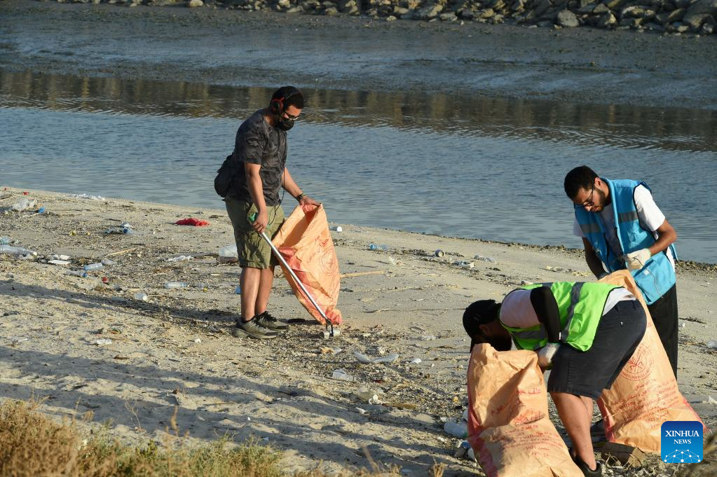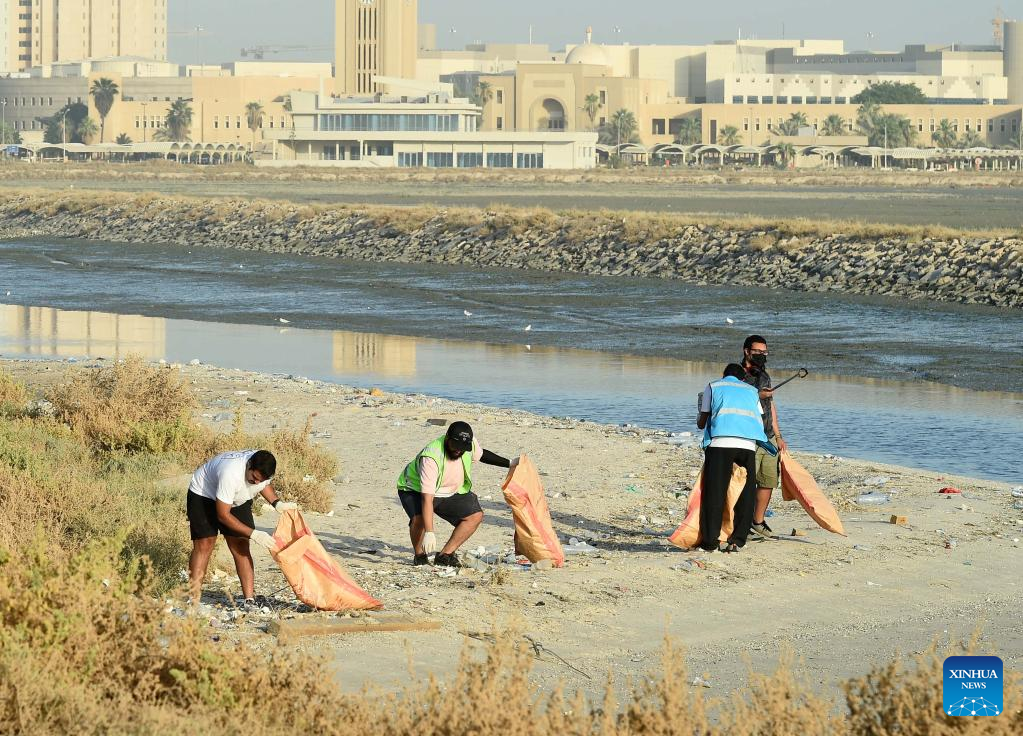 Volunteers participate in a beach cleaning campaign in Capital Governorate, Kuwait, on June 18, 2022. (Photo by Asad/Xinhua)
