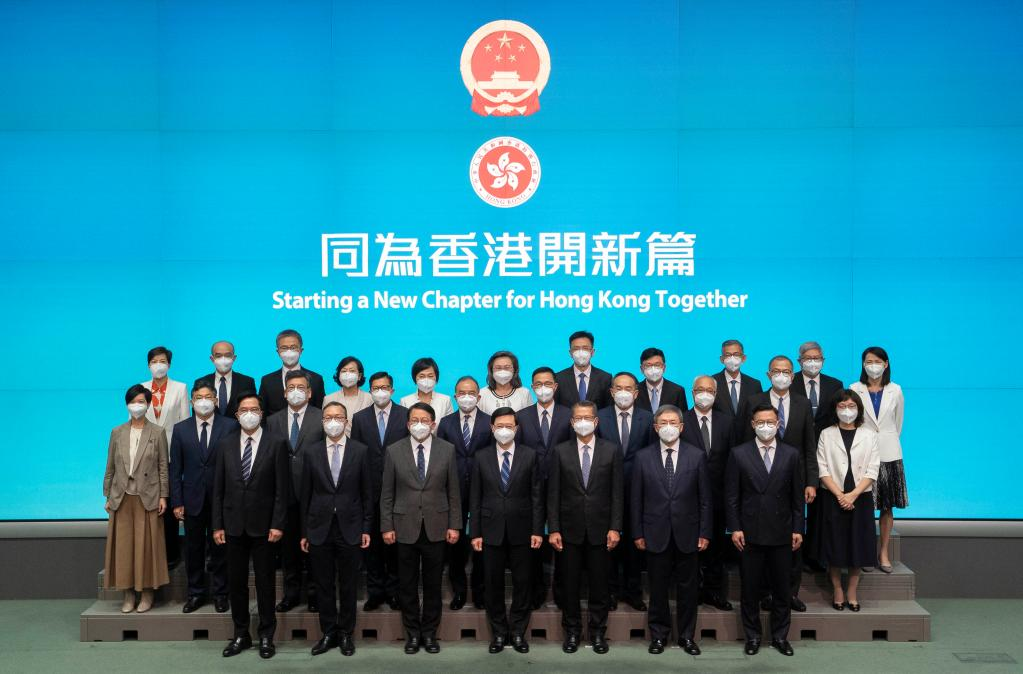 John Lee, the incoming chief executive of the Hong Kong Special Administrative Region (HKSAR), and principal officials of the sixth-term HKSAR government, pose for a group photo during a press conference in South China's Hong Kong, June 19, 2022. China's State Council on Sunday appointed principal officials of the sixth-term government of the HKSAR based on the nominations put forward by the incoming HKSAR chief executive John Lee. The officials will assume office on July 1, 2022. (Xinhua/Lui Siu Wai)