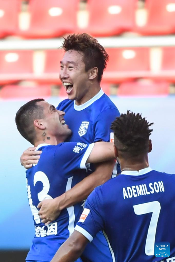 Marcos Vinicius Amaral Alves (3rd L) of Wuhan Three Towns celebrates scoring during a 2022 season Chinese Football Association Super League (CSL) match between Wuhan Three Towns and Shanghai Port in Dalian, northeast China's Liaoning Province, June 19, 2022. (Xinhua/Wang Yijie)