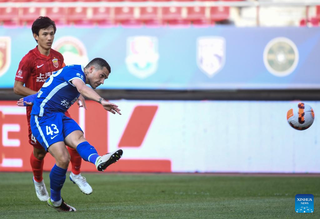 Nicolae Stanciu (R) of Wuhan Three Towns shoots during a 2022 season Chinese Football Association Super League (CSL) match between Wuhan Three Towns and Shanghai Port in Dalian, northeast China's Liaoning Province, June 19, 2022. (Xinhua/Wang Yijie)