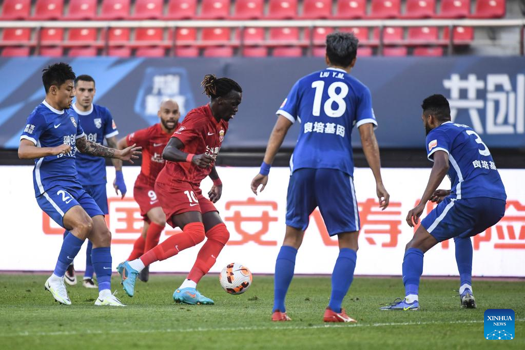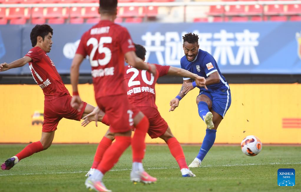 Ademilson (1st R) of Wuhan Three Towns shoots during a 2022 season Chinese Football Association Super League (CSL) match between Wuhan Three Towns and Shanghai Port in Dalian, northeast China's Liaoning Province, June 19, 2022. (Xinhua/Wang Yijie)