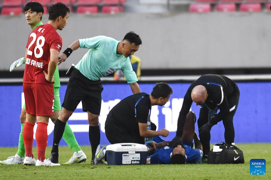 Cherif Ndiaye of Shanghai Port gets injured during a 2022 season Chinese Football Association Super League (CSL) match between Wuhan Three Towns and Shanghai Port in Dalian, northeast China's Liaoning Province, June 19, 2022. (Xinhua/Wang Yijie)