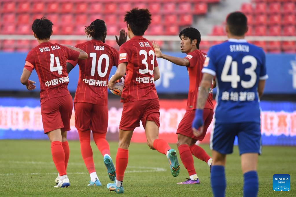 Cherif Ndiaye (2nd L) of Shanghai Port celebrates scoring during a 2022 season Chinese Football Association Super League (CSL) match between Wuhan Three Towns and Shanghai Port in Dalian, northeast China's Liaoning Province, June 19, 2022. (Xinhua/Wang Yijie)