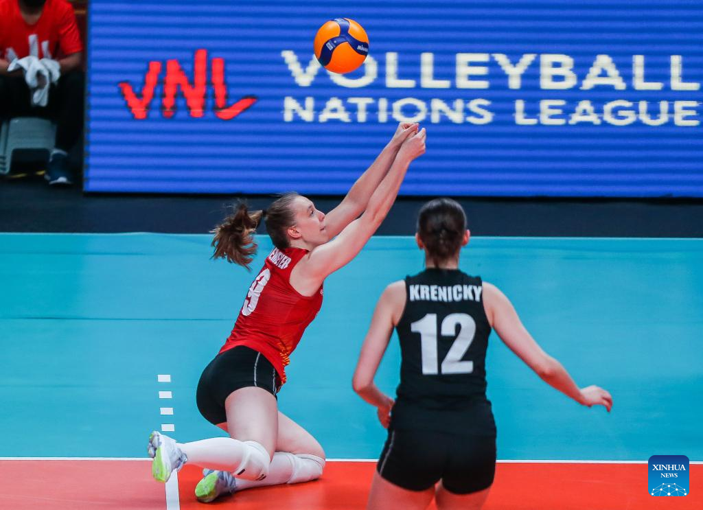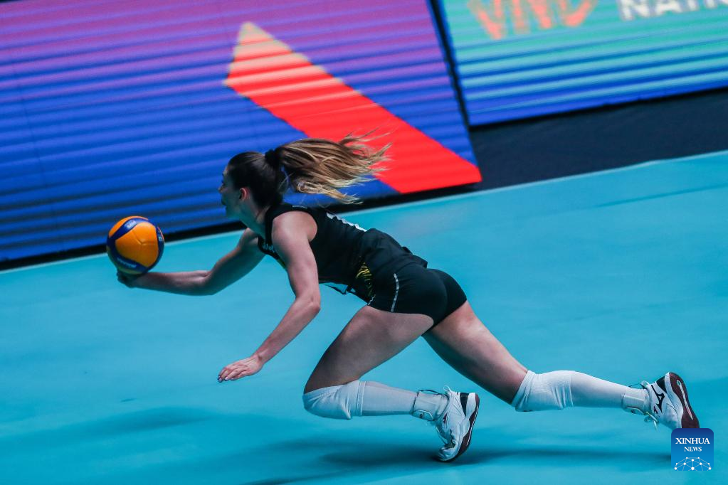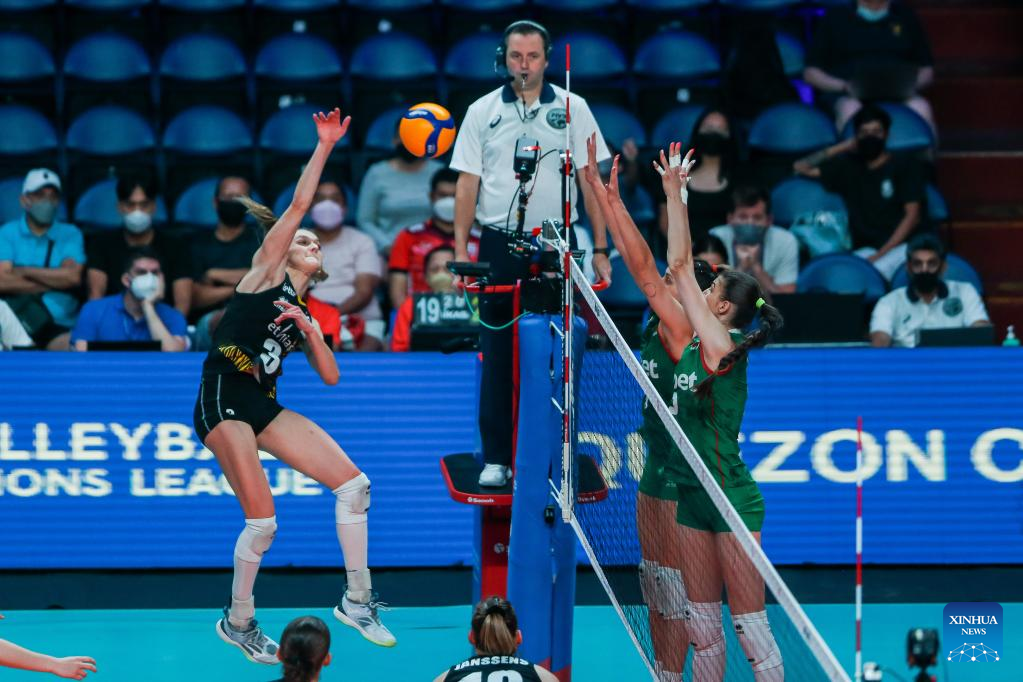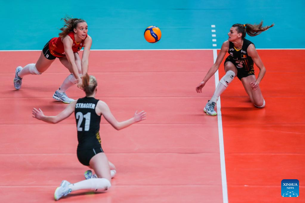 Players of Belgium compete during the FIVB Volleyball Nations League Women's Pool 4 match between Bulgaria and Belgium in Quezon City, the Philippines on June 19, 2022. (Xinhua/Rouelle Umali)