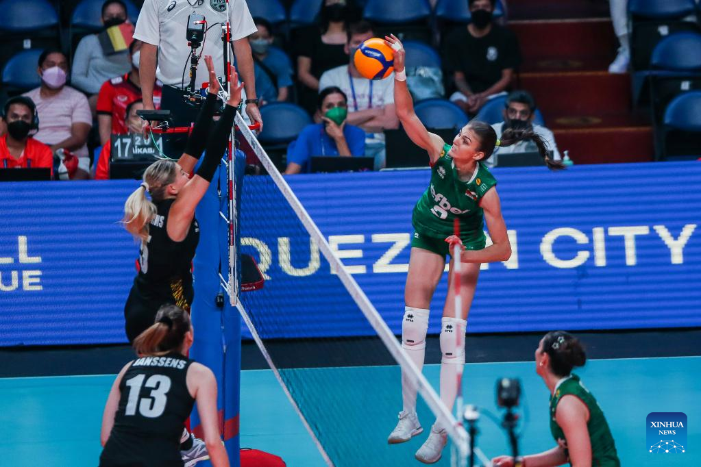Jodie Guilliams (L) of Belgium spikes the ball during the FIVB Volleyball Nations League Women's Pool 4 match between Bulgaria and Belgium in Quezon City, the Philippines on June 19, 2022. (Xinhua/Rouelle Umali)