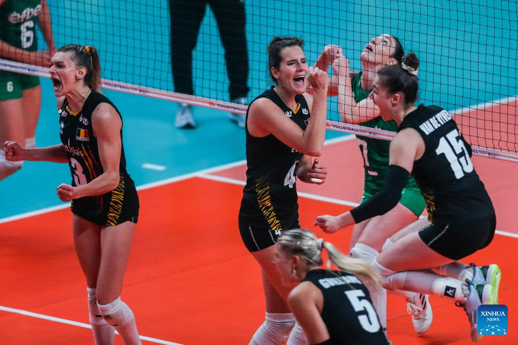 Players of Belgium celebrate after scoring a point during the FIVB Volleyball Nations League Women's Pool 4 match between Bulgaria and Belgium in Quezon City, the Philippines on June 19, 2022. (Xinhua/Rouelle Umali)