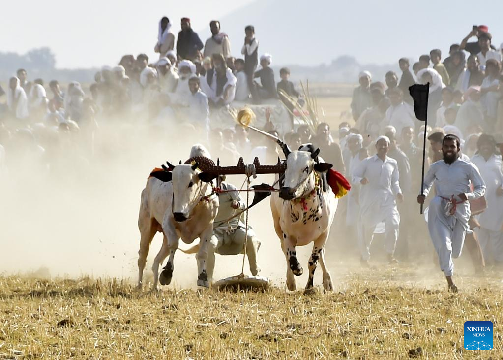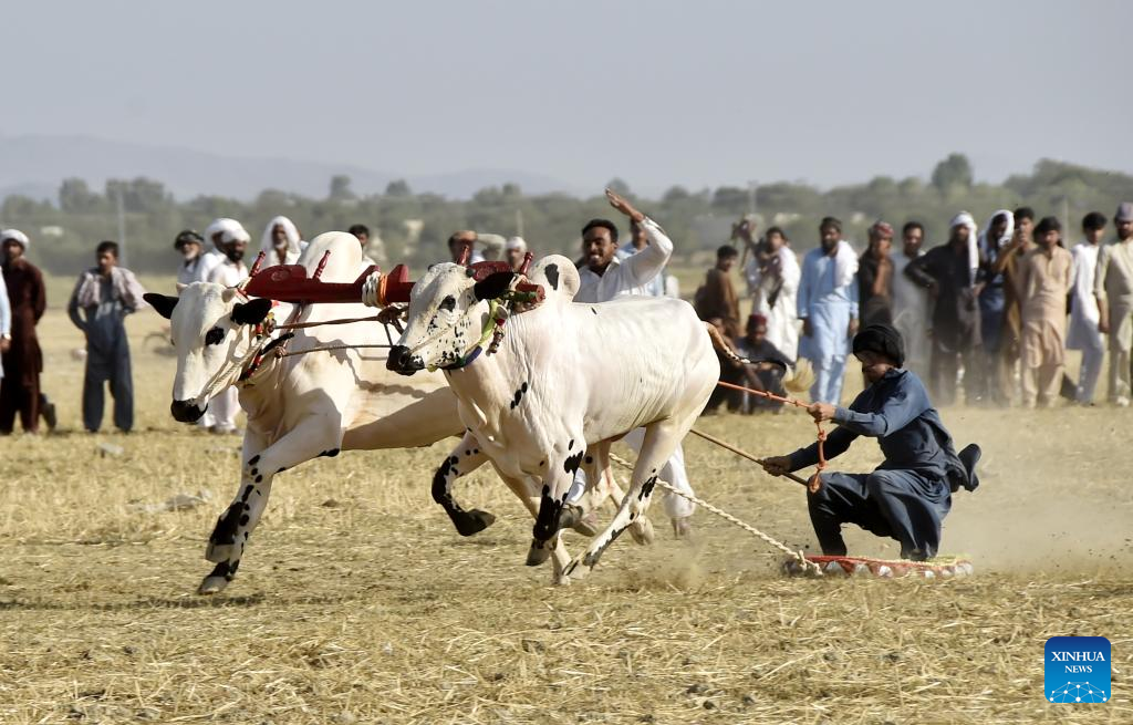 A farmer guides his bulls as he competes in a traditional bull race on the outskirts of Haripur in Pakistan's northwestern Khyber Pakhtunkhwa province, June 18, 2022. (Photo by Saeed Ahmad/Xinhua)