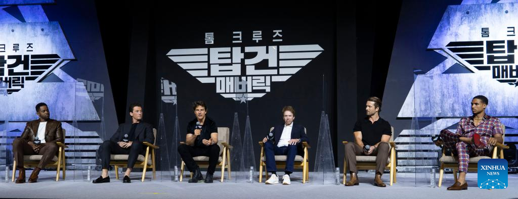 Actor Tom Cruise (3rd L), producer Jerry Bruckheimer (3rd R) and the cast of "Top Gun: Maverick" attend a press conference during the film's global promotional tour in Seoul, South Korea, June 20, 2022. The film will hit theaters in South Korea from June 22. (Photo by James Lee/Xinhua)