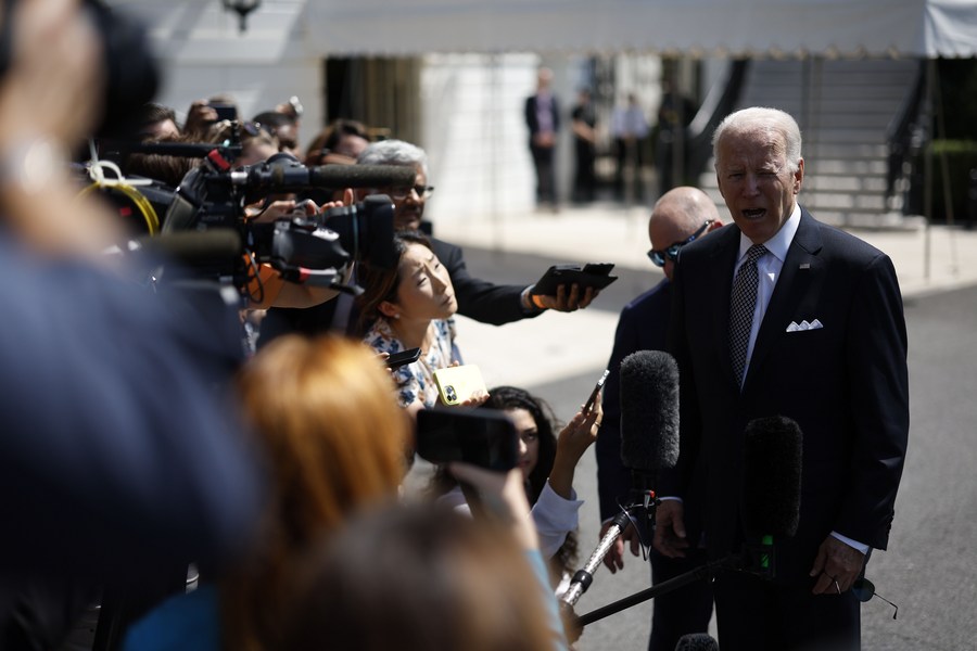 U.S. President Joe Biden (1st R) speaks to members of the press at the White House in Washington, D.C., the United States, on June 17, 2022. (Photo by Ting Shen/Xinhua)